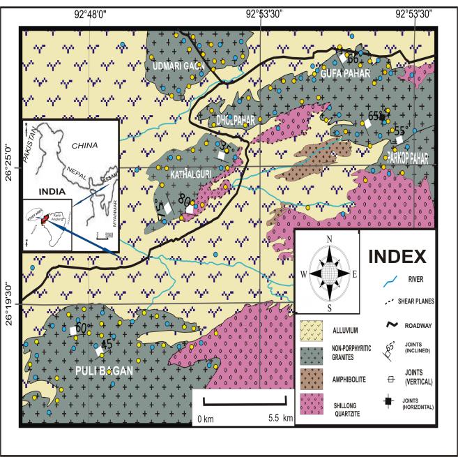 with Proterozoic and Tertiary sediments. The intrusive/extrusivebodiescontainatleastfiveepisodesof magmatic activity, including an early phase of basaltic composition,thesecondandthirdphasesoflargebatholiths of porphyritic granitoids, the fourth phase of small-scale intrusionsofdoleritesandtrapsknownastheMikirTraps, andalatephaseofalkaline-carbonatiteformation.Thestudy domain (Fig.1) carries evidences of evidences like flow banding, breccias with chilled margins having necessary indicationsofviolentintrusionthroughcoldercrustinpost collision extensional settings. The Pan-African episode leadingtomassivegranitoidsformationduringPan-African episodewasasuddenandshortlivedphenomenon,causing invasionofmagmathroughgneissicbasementcomplex,older amphibolites and Shillong Group of supracrustals. These granitoids carry evidences of true volcanic domain, where thegranitoidsbeardegassingvents,vesiclesoccasionallyat theirapophyses,eitherREEorUandThenriched.