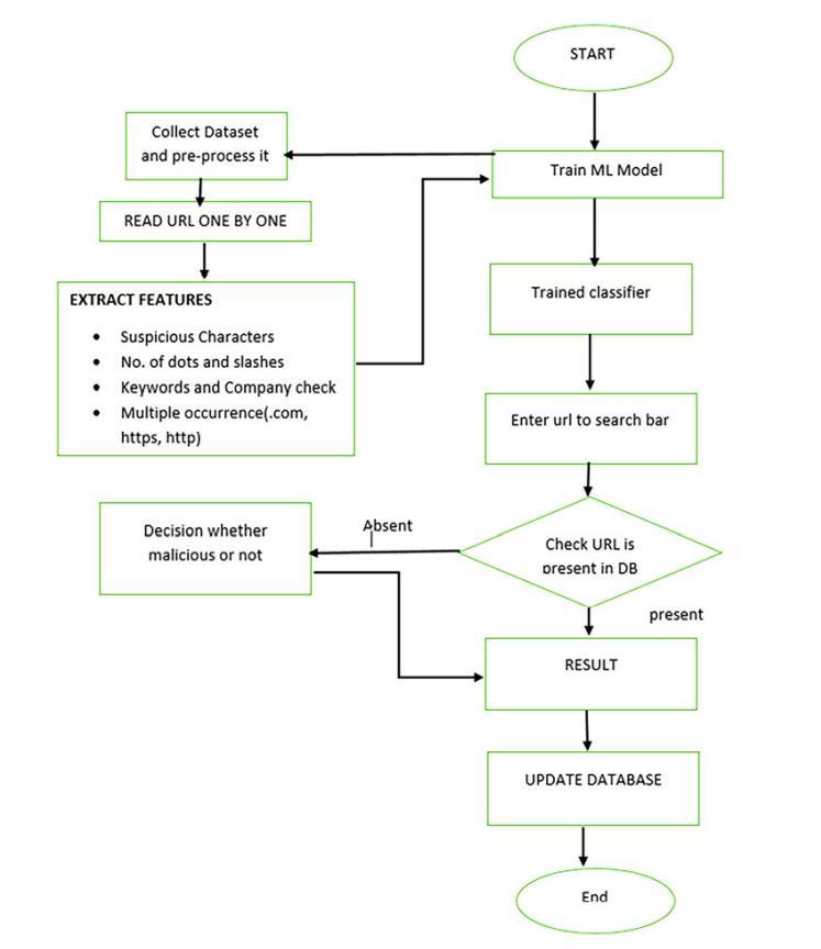 We divided the dataset in a training test used to fit the features and feed the model. The URL is checked in the database and if it is present in the database, it has been already checked as malicious or not. But if the URL is not present in the database, then it will go through all the operationsandprovidetheresulttotheuserasmaliciousor not.