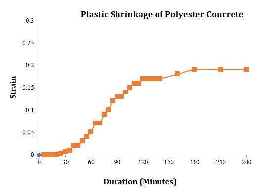 ThegraphinFigure4givesanillustrativeideaofthestrain inthe0.3%polyesterfiberconcreteversusthetimetakento measurethereadings.Itisacurvewhichshowsthatplastic shrinkage starts remaining constant after 2 hours after whichthehorizontaldeformationceasesafter48hours.