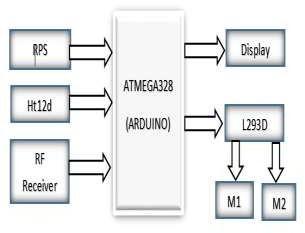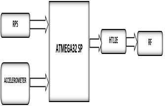 The block diagram is depicted in fig 2. Arduino (ATMEGA328P), LCD display, accelerometer, transceiver are the major components of this system. The actual control sectionis depicted in fig.3 where the RPS and accelerometer are connected to the Arduino itself.