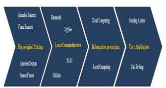 Intheabovediagramweareusingastructurethatcan bedivided into four layers, namely Local Communication Layer (LCL), Physiological Sensing Layer (PSL), User application Layer (UAL) and Information Processing Layer(IPL).HerethePSListhefundamentallayerwhich has different sensors which is used to collect physiological and ambient data from the human being monitored. LCL is the layer responsible for sending the signals to the above layers for further processing and analysis. This layer might have both wireless and wired methods of transmission, connected to cloud computing platforms or to local computing facilities. Local Communication Layer typically takes the form of one or more than one communication protocols, including wireless mediums such as ZigBee, Bluetooth, Wi-Fi, or even wiredconnections.IPLisa majorcomponentofthe system. It includes hardware as well as software components, such as micro-controller, to analyse and transferdata fromPSLtothe abovehigherlayers.UALis concerned with applications that assist users. For example, if a fall is detected in the IPL, a notification is initiallysenttotheuserandtheniftheuserconfirmsthe fall or does not answer back, an alarm is sent to the emergencycaregiverwhoisexpectedtotakeappropriate actions.