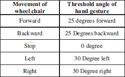 When the arm is in a neutral position the motor does not functionand the wheelchair is in a halted position. By shifting their hand from the relaxed position the user provides the direction for the wheelchair to move. Extending the hand beyond the neutral position causes wheelchair motion, while trying to bend the arm closer to thebodycausesthebendbackwards.Thismakesiteasyto control the direction of the wheelchair by changing the userhand’sposition.Oncethepersonaddshishandtothe stableposition,thewheelchairhalts.