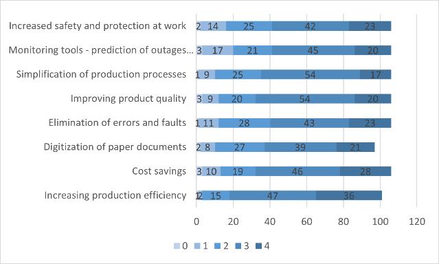In the following section, we looked at the advantages that organizations obtain by implementing automated production. We observed the following advantages: improved production efficiency, cost savings, and digitization of paper documents. Errors and flaws are eliminated, product quality is improved, production procedures are simplified, monitoring tools are used to predict outages and provide an overview of the present status of production, and finally, workplace safety and protection are improved. The evaluation was given on a scaleof0to4,with0denotingnobenefitand4denoting a significant/key benefit. The total results for all examined companies are shown in Figure 2. The following categories received the highest ratings (on a scale of 1 to 3): boosting production efficiency, cost savings, enhancing product quality, and simplifying production processes. The favorable effect was boosted by features such as the removal of errors, monitoring systems,andthedigitizationofpaperdocuments(inthe scale mostly 3 and 2 ranking). The features of greater safetyandprotectionatwork,aswellasthereductionof errors, dominated the scale rated 1 and 2. The most essential factors for medium and big enterprises, according to the analysis by number of employees, are production efficiency, digitization of paper manufacturing, simplification of production processes, andmonitoringsystems.It'salsoworthemphasizingthe cost-cutting criterion, which was imposed by the majority of small businesses. In the theoretical section, wediscussedtheindividual benefitsandcauses.Eachof these advantages, on the other hand, is an important aspect of any company's daily operation on the market. Cost savings and improving product quality were the mostimportantconsiderationsforenterpriseswithalife cycleofmorethan15yearsandoperatingonthemarket duringthestabilizationandgrowthperiod.
