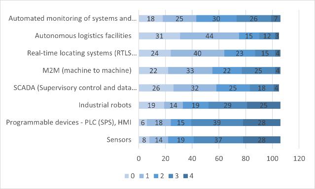 Other technologies that complement automated manufacturing - IoT, cloud computing, big data, 3D printing, artificial intelligence, process simulation, energymonitoring,andothers-wereinvestigatedatthe application level. The evaluation was based on a Likert scaleof0to4,with0denotinglittleorlimiteduseand4 denoting advanced use. The results in Figure 3 demonstrated that sensors, programmable devices, and industrial robots were used at an advanced level. These technologies were generally employed in huge organizations with a 5-15 year history on the market that were still in the early stages of their operations. Medium-sized businesses affirmed the lower degree of use (on a scale of 0 to 1) of SCADA, M2M, and autonomous logistics facilities during the stabilization phase. SCADA is a system that aids firms in operational production but is not widely employed. It may monitor energy use and hence give input data for prospective system optimizations, in addition to reporting current status in manufacturing. Finally, the benefits of automated monitoring in manufacturing organizations can be summarized as follows: lower equipment maintenance costs, higher system availability, fewer outages, and early error identification. Energy consumption efficiency can also be monitored using monitoring tools. The absence of these systems in manufacturingorganizationsmightresultinanumberof disadvantages when compared to competitors in the industry. As a result, organizations must adapt to these developmentsandprepareforthedifficultiesahead.