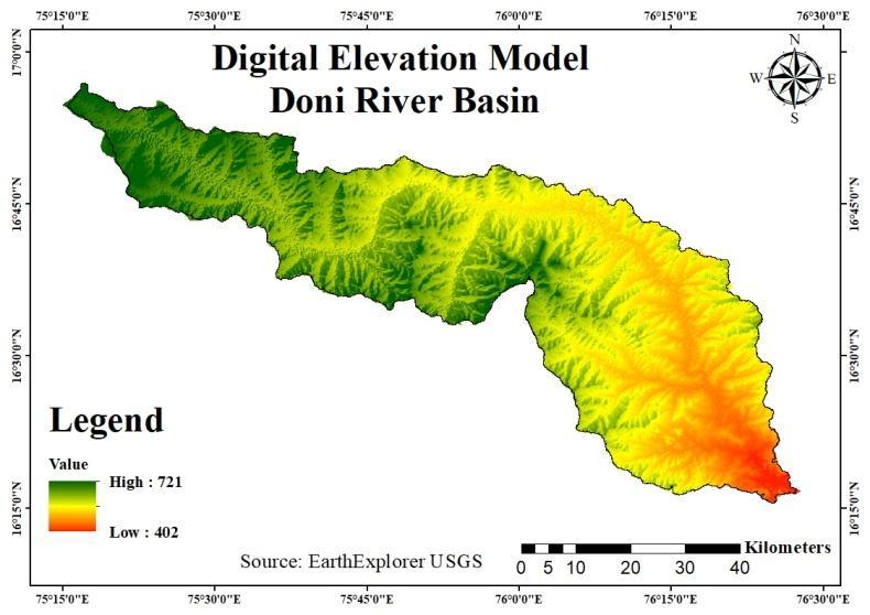 acquired through shutter radar topographic mission (SRTM) is available for the globe. The DEM was filed by ArcSWATinordertoavoiderroneousflowdirectionraster. TheclippedDEMishavingtheelevation rangingfrom402 mto721mandtheresultedDonidigitalelevationmodelis shownbelowMap.