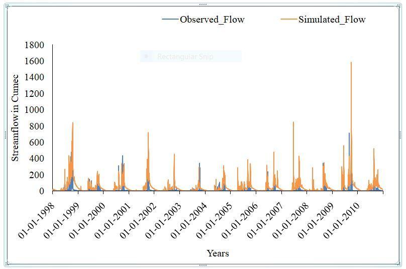 In the present study area Doni basin, the following plot shown in the daily calibration of observed and simulated flow period from 1998 to 2010 years. From the Fig.18below it is seen that all high peaks are overestimated, and, in many events, deviation could be clearlyseenbetweenobservedflowandsimulatedflow. It can be seen clearly that many of the peaks in the respective figures are not matching. Some peaks are matching but overestimated. This may be due to uncertainty in input datasets particularly use of rainfall data,LanduselandcoverandSoilproperties.