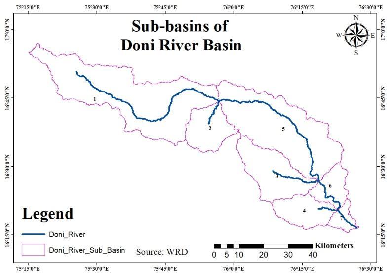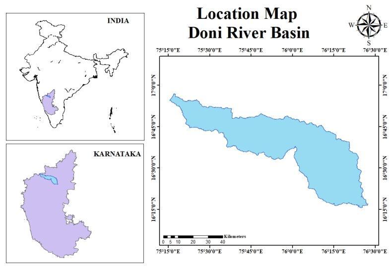 TheDoniRiverbasinistakenasstudyareaforthepresent work, which lies on the Krishna River basin in Vijayapura district.Ithasalongitudeof 770, 15 ' , 22''E to770, 26 ' , 15'' E and latitude of 130, 27', 45'' to 130, 15 ' , 30'' N and Doni is the major tributary of Krishna River. The basin areauptotheconfluencepointofDoniwiththeKrishnais about 2900 km2. However, the Central Water Commission has established a gauging site upstream of the confluence coveringabout 1344.18 km2ofDoniwatershed.