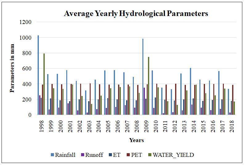 SWAT modelling for flow, sediments and nutrients have been performedsoastoattainthepollutantsdetailsusing land use and soil distribution data for a watershed as a result of which the pollutant sources that exists involve dairy manure application fields, wastewater treatment plants, croplands, and urban areas. In the Doni Basin the Average Monthly and Yearly Hydrological and Nutrient parameters like Runoff, Lateral Flow, Water Yield, Evapotranspiration,PET,Sedimentyield,TotalNitrateand Total Phosphorus are obtained by model. The basin average hydrological parameters and values for the 20 yearsthatisfrom1998to2018areshowinTable4.