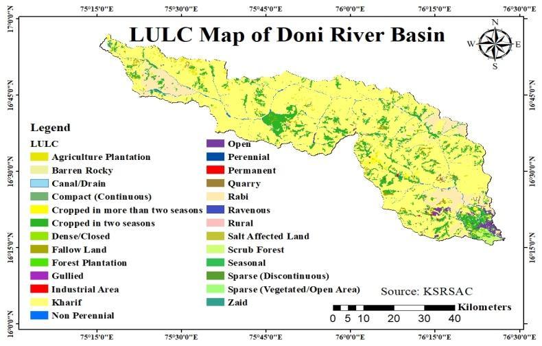 LULCData obtained from Karnataka StateRemote Sensing Application Center (KSRSAC), which stood very much usefulinderivingdifferentlandusesandlandcoverofthe study area considered. Major classes classified include water,forest,barrenland,agricultureland,rangelandand agriculture Land. The Land Use map of DoniRiver Basin is showninMapbelow.