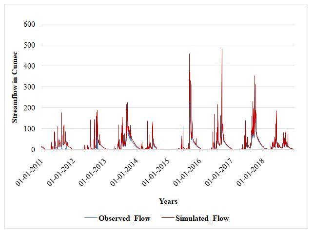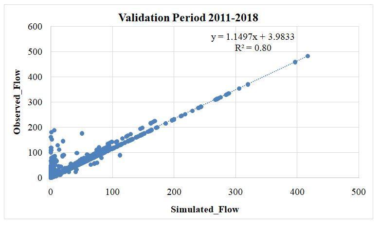Validation was performed with the same parameter value rangesandrunningwithsame500numberofsimulations. The validation period was taken also for 8 years (20112018). Fig.16 shows the daily validation plot between observed flow and simulated flow. In order to distinguish properly the graph showing the plot of observed and simulated flow for validation, the plot representing period from 1st January 2011 to 31st December 2018 were prepared. Simulated flow was nearly as close to the actual measured flow. some of the peaks did match and it also showed that the model did not response to some peaks of the observed flow. This could be the contribution of baseflowanduncertaintyininputdata.