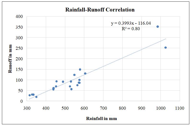 For the study the daily rainfall data of 19 gauging stations isusedandallotherweatherdataarecollectedfromWater Resources Department (WRD) and Fig.13 shows the Annual comparison between rainfall and runoff of the DoniBasinreceivedhighestrainfallintheyearof1998and 2009in the 20 years of period from 1998 to 2018.Fig.14 shows the Rainfall-Runoff Correlation coefficient was foundtobe0.80.