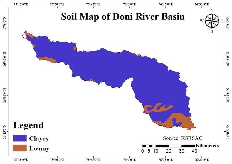 The soil map was obtained from the K(KSRSAC) and converted symbology as per Food and agricultural organization (FAO), Global. Soil data of Doni River Basin has been divided mainly into two groups i.e. clayey and Loamymajorityof thesoilinDoniRiver Basinfallsunder clayeysoilclass.Soil mapof Doni RiverBasin isshownin Map.