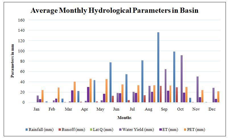 Fig.10 show the bar charts comparing the average monthly rainfall, runoff, Lateral Flow, Water yield, evapotranspiration and PET of the Basin, August and SeptemberisthemonththathashighestRainfall andalso September and October month has highest evapotranspiration this may be due to the earlier months thathavesaturatedthesoilthewatertablesrisingmaybe contributingtotherevapoftheshallowaquifers.