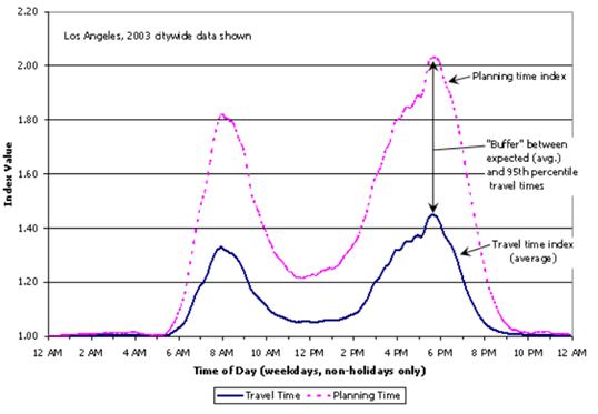 3showstherelationshipbetweenthetraveltimeindex,the bufferindex,andtheplanningtimeindex.Thetravel time index represents the average additional time required duringpeaktimesascomparedtotimesoflighttraffic.The bufferindexrepresentstheadditionaltimethatisnecessary abovetheaveragepeak travel time,whereas theplanning time index represents the total travel time that is necessary.[3]