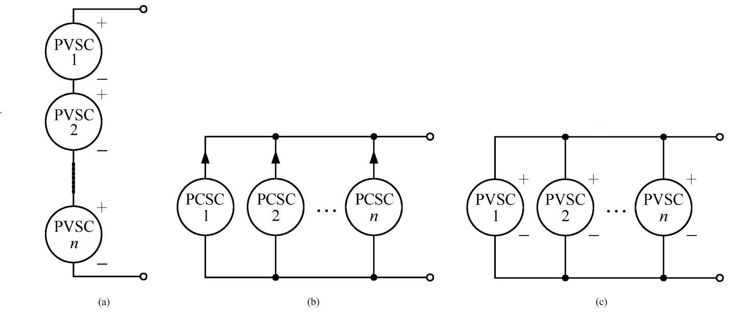 Furthermore, as PVSCs are switching source cells, connecting them in parallel is possible without breaking Kirchhoff's rules, provided that they are not simultaneously delivering power, which would result in a direct parallel connection of voltage sources. In other words, assuming the appropriate switching configuration is in place, PVSCs can also be connected in parallel, as showninFig.2.(c).Similar tothis,asPCSCs are switching source cells, they can theoretically also be connected in series.