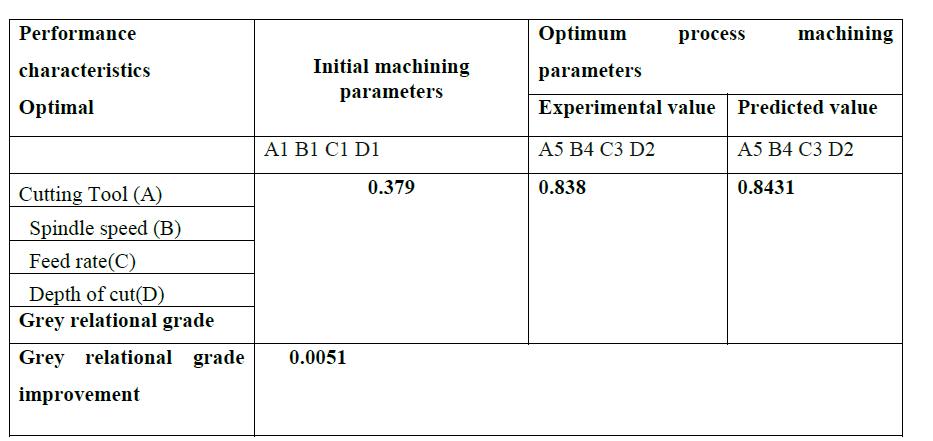 The improvement of grey relational grade from initial parameter combination (A1–B1–C1 D1 to the optimal parametercombination(A5B4C3D2)isfoundtobe0.0051