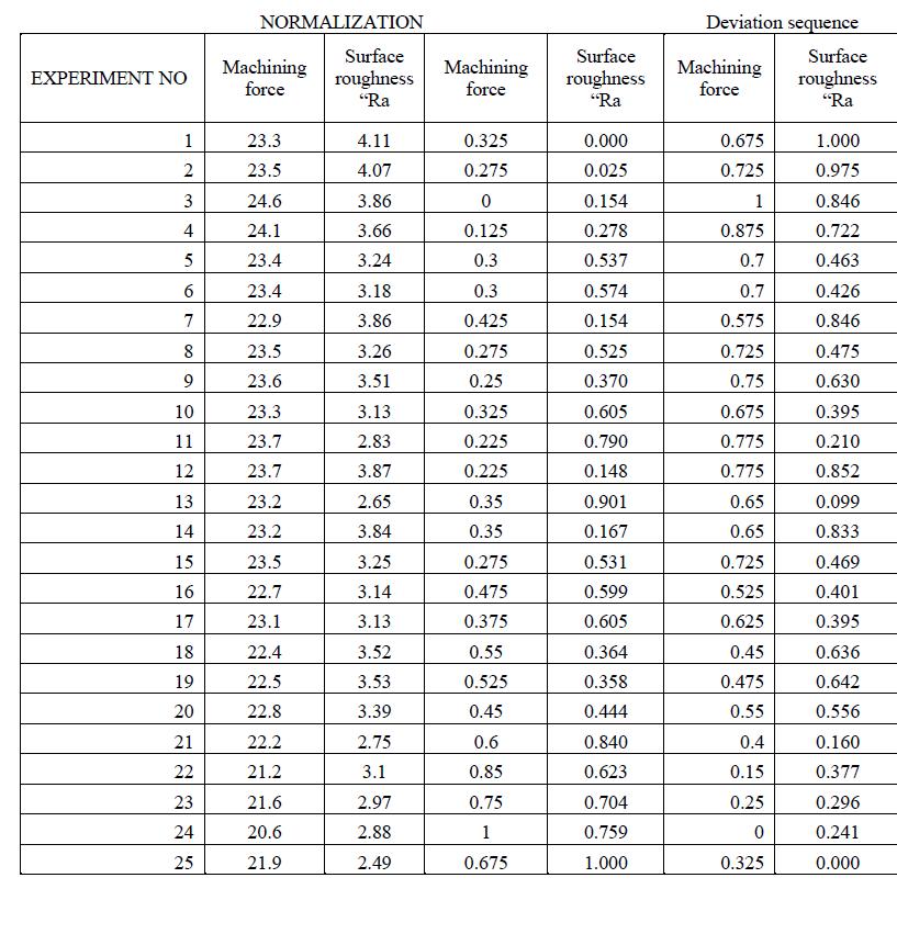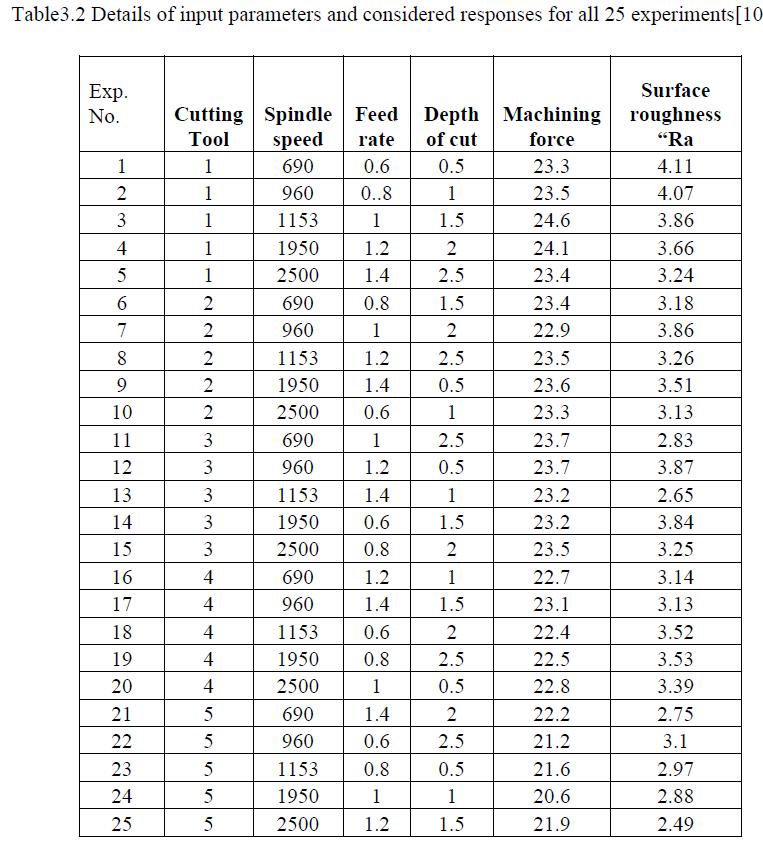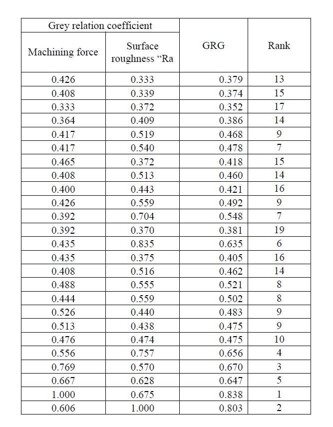 TheTaguchiOrthogonal Array(OA) technique,whichwas usedtodesigntheexperimentallayout,wasusedtoobtain the response values of Machining force and Surface roughness"Ra."Experiment24wasdeterminedtohavethe highestvalueofgreyrelationalgradeandwasrankedfirst. Thefactorsforexperimentnumber24aremachiningforce "Fm"(N)20.6,surfaceroughness"Ra"(m)2.88.