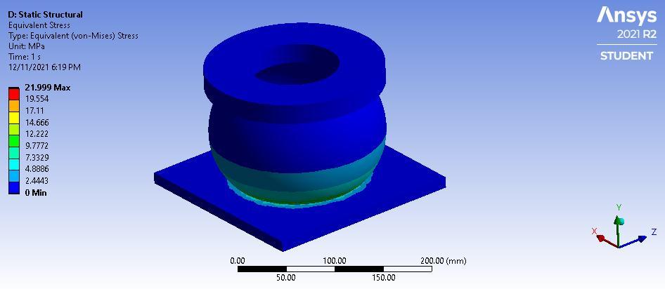 Themaximumequivalentstressisobtainedatthecontact regionbetweenbottomsupportandcylindricalregionwith magnitudeof9.77MPa.