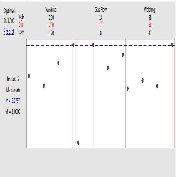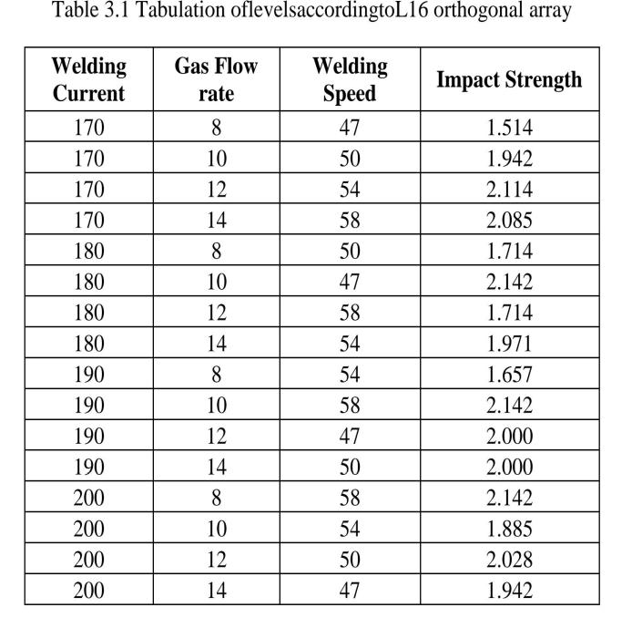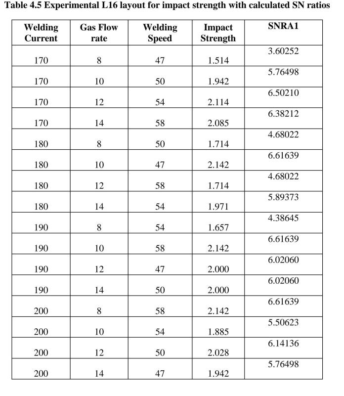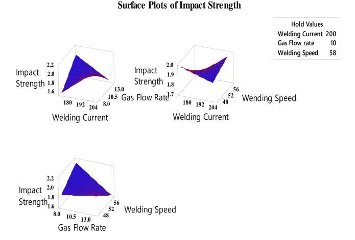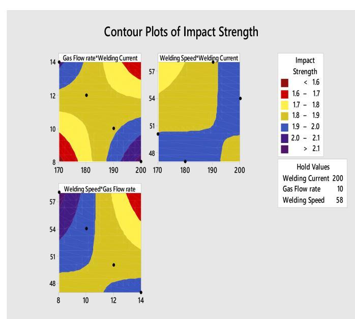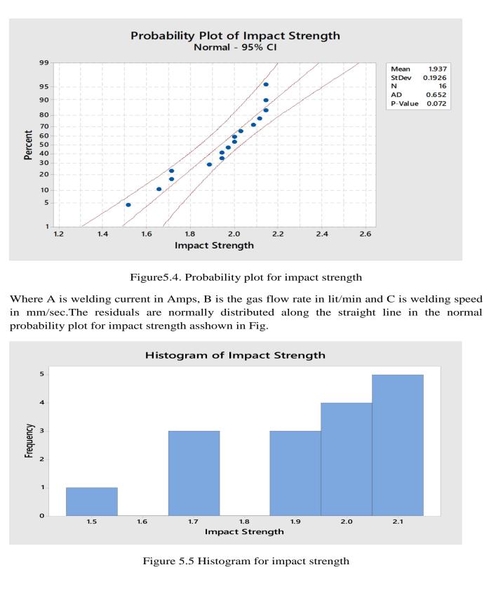 5.ImpactstrengthANOVAresult(J).Itisdiscoveredthatthe mostsignificantinfluenceonimpactstrengthistheGasflow rate (L/min) (P=0.393) (32.62%), followed by Welding Speed(mm/s)(P=0.859)(6.90%)andtheleastsignificant influence is the Welding Current (A) (P=0.900) (5.22%). Weldingcurrentisaninsignificantfactorforimpactstrength inthecurrentstudy.