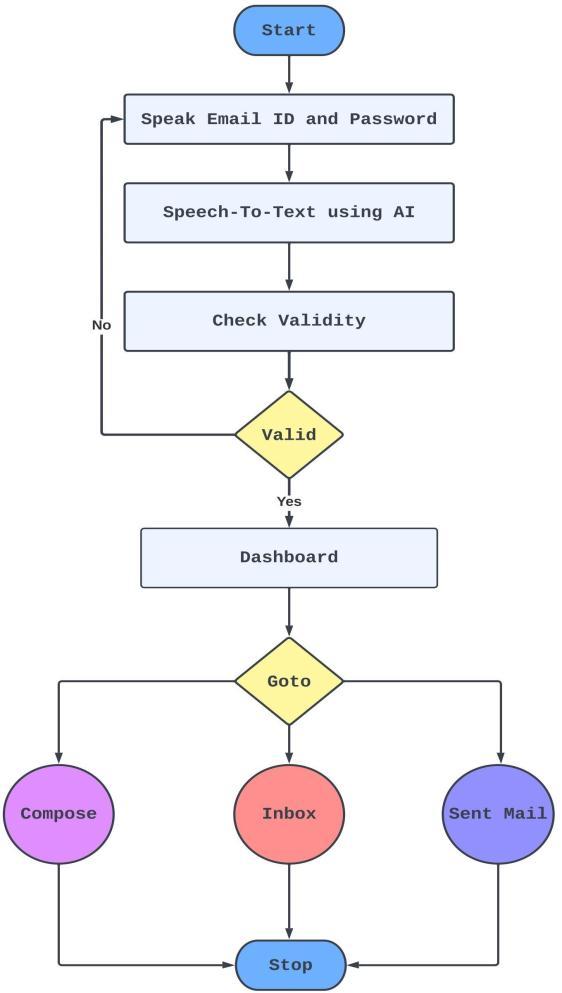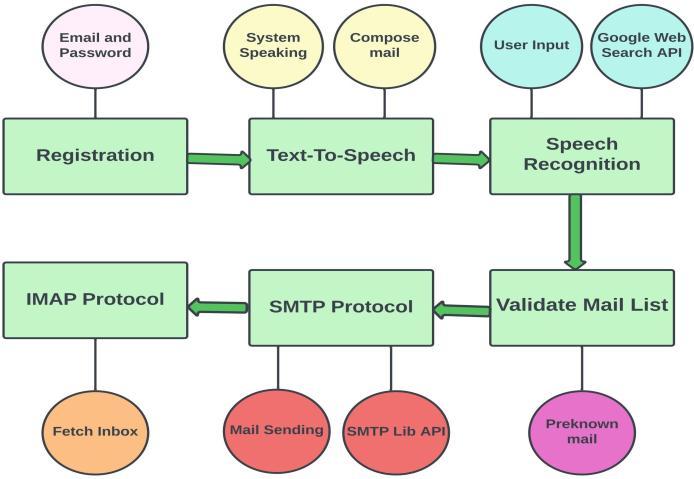 Theusermustfirstcompletetheregistrationforminorder to use the programme. The user must be filled out using voicecommandsandalltheappropriatefields,anditwillbe scannedinfromthesite;assoonastheuserspeaks,itwillbe instantly recorded. After the user logs in, the system will promptforanemailidandpassword,convertaudiototext, and then approve the user by validating the database’s credentials.Afterasuccessfulsession,youmayasktheusers in the various parts to record your incoming and sent messages.