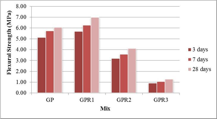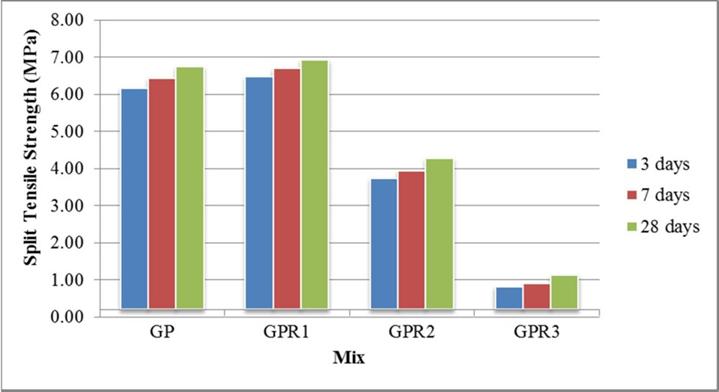 When comparing the 10% BRHA replaced mix GPR1 with control mix GP, there was a slight improvement in both split tensile and flexural strengths. The heat curing of the specimens along with a suitably increased SiO2/Al2O3 ratio and higher fineness of BRHA particles might have assisted the dissolution of ions and polycondensation mechanismofthegeopolymerframework.