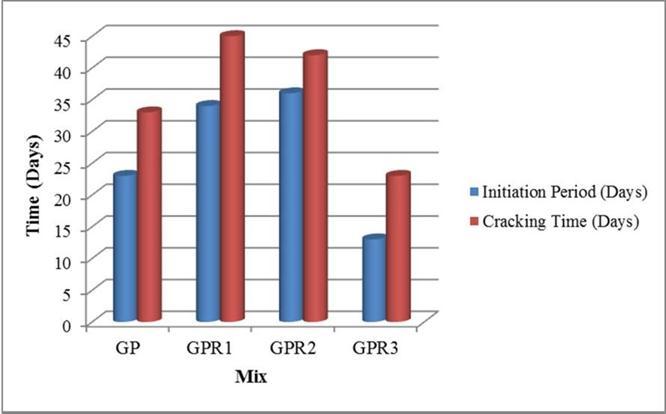 The accelerated corrosion test was conducted on cylindrical specimens of 100 mm diameter and 200 mm height with a 14 mm diameter steel rod embedded centrally so that equal cover was maintained on all the sides.Thespecimenswereovencuredat60°Cfor48hours after casting and then further cured in room temperature for28days.Thecylindricalspecimenswerethenplacedin individual containerseachcontaining4%sodiumchloride solution. The level of the solution was maintained at 75 mm from the bottom of the specimen throughout the test. A stainless steel plate was placed in each container which acted as the cathode whereas the steel rod embedded in concreteservedastheanodeandtheywereconnectedtoa constant DC supply of 6V so that the setup acted as an electrochemical cell. The voltage was maintained constantly throughout the test and current passing through each specimen was measured daily. At the instanceoftheappearanceoffirstcrackoneachspecimen, the specimens were stopped off the current supply and removed from the test setup respectively. Once the test was completed for all the specimens, a graph was plotted for the current passed in mA versus time in days to determine the corrosion initiation and propagation periods.