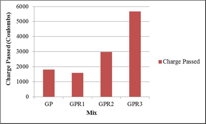 Rapid Chloride Penetration Test (RCPT):- BRHA replacement at a suitable level reduces the chloride ion penetrationofgeopolymerconcretewhichischaracterized by the micro filler effect of the fine BRHA particles. However, BRHA being silica rich, its excessive addition leads to an inappropriate silica-alumina ratio. This affects the dissolution mechanism of Si and Al ions and the subsequent rate of polycondensation thus leading to incompletealuminosilicate geopolymermatrix.Asa result of this, the structural compactability of the resulting geopolymer might not be dense which was what was believed to have caused the higher ion transport through the concrete. At 30% BRHA replacement, the structural compactability of GPC was clearly deteriorated which was evidentfromthefactthatitattainedverylowcompressive strengthunderalltheparametersconsidered.