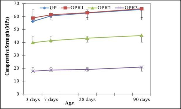 Increaseincuringtemperatureto90°Chadonlya moderate increase in the compressive strength. Hence oven curing at 60°C could be preferred for theGPCwhenBRHAisadded.