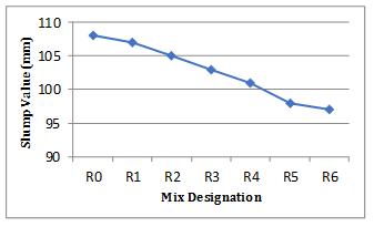 Sl.No. MixDesignation SlumpValue(mm) 1 R0 108 2 R1 107 3 R2 105 4 R3 103 5 R4 101 6 R5 98 7 R6 97
