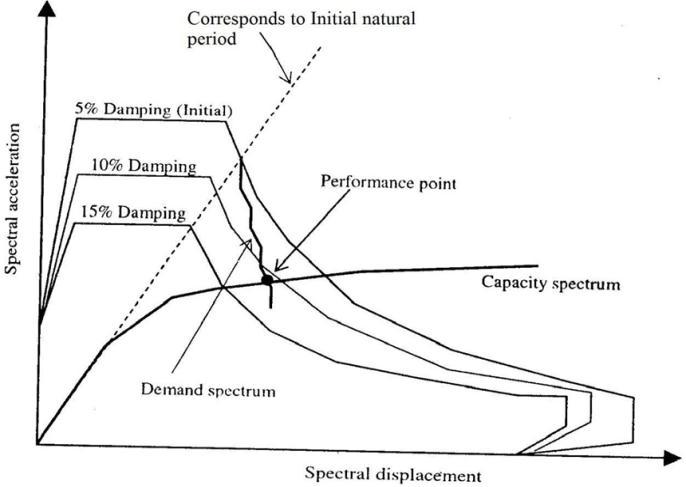 Capacity Spectrum and Building Performance Level:Capacityspectrumis the capacitycurve transformedfrom base shear versus roof displacement co-ordinates into spectral acceleration versus spectral displacement (Sa Vs Sd) co-ordinates. The performance point is obtained by superimposing demand spectrum on capacity curve transformed into spectral coordinates. To have desired performance, every structure has to be designed for the spectral acceleration corresponding to the performance point.