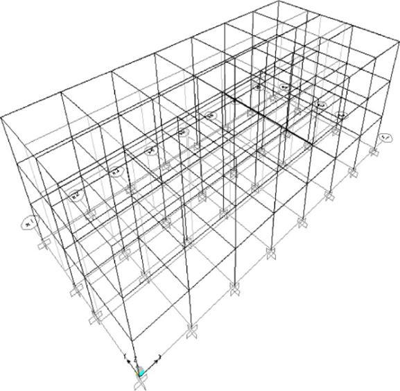 The three dimensional frame of the selected building having different types of lateral load resisting systems suchasR.C.bareframeandInfilledframewereconsidered in this study. Figure 3.4 shows the plan of the building representingtheXandYdirectionusedforanalysis.Figure 3.5 shows a three dimensional line sketch of the frame in the X, Y and Z direction. Figure 3.4 shows a typical longitudinal bare frame (in the X direction in XZ plane). Figure 3.5 shows a configuration model of braces representing infills. Figure 3.6 shows an elevation of the existing study hostel building. The building exists in India and is a typical example of many such buildings in this region.