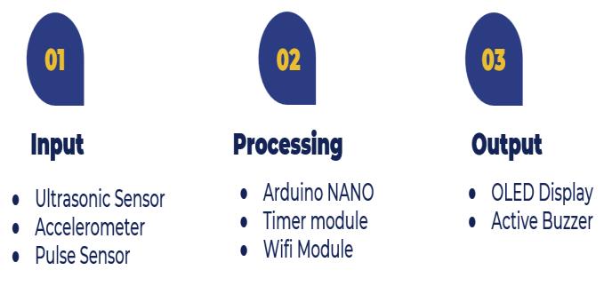 AttheinputstagewehaveusedanUltrasonicsensor,an Accelerometer, and a Pulse Oximeter sensor. At the processingstagewehaveusedanArduinoNanoasourmain microcontrollerboard,atimermodule,andaWi-Fimodule. Attheoutputstage,wehaveinstalledanOLEDdisplayand an active buzzer. We have used Arduino IDE and Things Speaksoftwareplatforms.[2]