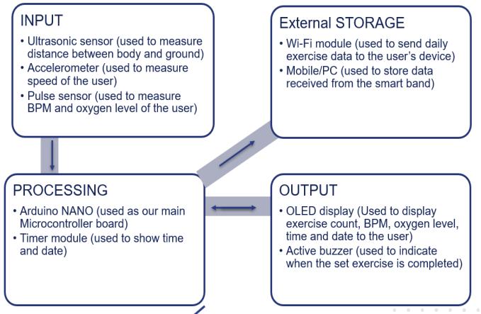 Inthissmartband,anUltrasonicsensorisplacedatthe chest level. Also, an accelerometer is placed beside the ultrasonic sensor. The user must set the count of exercise he/shewantstoperformandthenstarttheexercise.Asthe user starts exercising, the ultrasonic sensor measures the distancebetweenbodyandground.Theaccelerometerused measuresthespeedoftheuserwhileexercising.Thepulse oximetersensormeasurestheBPM(BeatsPerMinute)and Oxygen level content present in the user before exercise, duringexerciseandafterexercise.Thishelpstokeepaneye onhis/herhealthandavoidexertion.Allthedatacollected