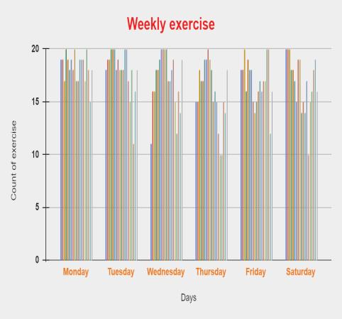 Figure14.showtheconsistencyinexercisebytheuser. As the user performs exercise while using the proposed system,theaccelerometerusedinitmeasuresthespeedof user’s body and monitors it. Also, a graph is plotted for virtual representation of consistency in user’s exercise routine.Theusercankeepatrackofexerciseusingsuchdata andcandevelophis/herexerciseroutine.