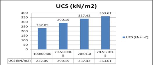 Clayey Soil :SCBA: N.F Curing Period (Days) UCS (kN/m2) 100:00 7 232.05 79.5:20:0.5 7 290.15 79:20:10 7 33743 785:20:15 7 36361