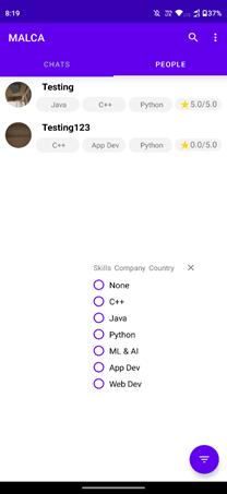 Figure 7: Screenshots of the rating and filter screen, in this screen the user can see the user info as well as the skills, ratings and can select a filter.