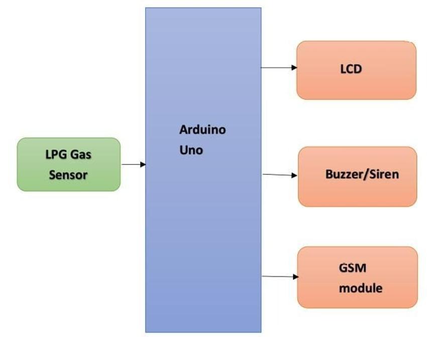 When the gas is leaked and detected by the MQ-5 sensor thesignalissenttotheArduinoUNO whichinturnsends signaltoothersecondarydividesconnectedtoitwhichare the buzzer which after receiving the signal starts to buzz, next is the LCD display which is also set to on after receiving signal from microcontroller then the last is the GSMunitwhichalsoreceivesthesignalfromArduinoUNO andthenstartstofunctionandsendsthemessageas“The gas leakage has been detected!!!!!” to the phone numbers alreadydefinedinthecode.