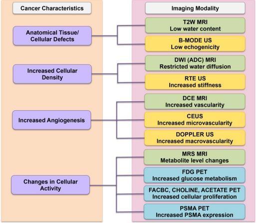 Hodge et al. pioneered prostate transrectal biopsies using grayscale B-mode US imaging in 1989. Transrectal USswiftly replacedphysicalDREforguidingneedlebiopsiesforPCadiagnosis.Today,imagingisessentialforPCa management.US, MRI,andPETareusedtodetectandlocalizePCa.B-modeorgrayscaleUSisstillthemost extensivelyusedPCadetection modality, although new scientific data are highlighting additional promising modalities. Previously utilized mainly for stagingandrecurrencedetection,clinicsworldwidearenowusingmpMRI for PCa detection via direct in-bore MRI-guided biopsy or MRI–US fusion-guided biopsy. CEUS and RTE have become promising US-guided PCa detection methods. This suggests a promising future for an integrated multimodality (mpUS and mpMRI) PCa detection strategy. PET imaging for PCa is useful for cancer staging, biochemical failure after radiation, and restricted diagnosis. Tumor biology and evolution are complex. To choose the best imaging method, one must understand tumor growth mechanisms. Figure 2 summarizes the tumor traits that imaging methods exploit. Grayscale or B-mode US modalities image zonal anatomical deficitsproducedby prostaticcancers.DopplerUSandCEUSimagetumormacrovascularityandmicrovascularitybecause tumorsareangiogenic.ProstateRTEreliesonrigidPCa tissue.mpUSormpUS-basedimagingofPCausesanatomicaland functionalUS imaging techniques.Researchers worldwidearestudying this.Standardizing intraprocedurempUS imaging andlesionassessmentmayenableaccurate,cost-effectiveoffice-basedprostatebiopsies.