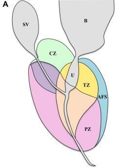 The structure of the prostate. Therectumcoverstheprostateglandfrombehind,whilethebladdercoversitfromabove.The urethraispartiallyencircledbythegland.Basereferstotheendoftheglandclosesttothebladder,whereasapexdescribes theend oftheglandclosesttotheexternalurethralsphincter.Theprostateisdividedinto four anatomical regions called McNeal zones: the peripheral zone (PZ), which contains about 70% of glandular tissue;thetransition zone(TZ),which containsabout5%ofglandulartissue;thecentralzone(CZ),whichcontainsabout25%ofglandulartissue;andtheanterior fibromuscularstroma,whichcontainsabout0%glandulartissue(Fig.1A).PCaincidenceratesareasfollows:68%inthePZ, 24%intheTZ,and8%intheAZ(CZ).4Image-guidedinterventionalprocedures,suchasaprostatebiopsy,makeitsimple toidentifytheseareas.