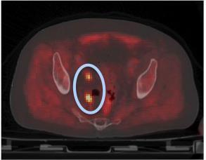 – 6: PET/CT image postprostatectomy depicting possible lymph node metastasis (blue oval withorange hot spots)