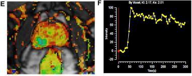 Fig – 4 : The mpMRI depiction of right posterolateral lesion: (A) axial T2-weighted image with lesion inred outline, (B) 3D T2-weighted view of prostate contour (brown) and lesion (red), (C) ADC image with lesion in red outline, (D) computed high b-value = 2000 seconds/mm2 image with lesion in red outline, (E) dynamic contrast-enhanced pharmacokinetic map with lesion in red outline, (F) average time–signal intensity curve plot of the lesion, and (G) PIRADS version 2 location of lesion (orange). Dynamic contrast-enhanced imaging. DCE-MRI uses 3D T1-weighted images before, during, and after intravenous contrast media injection (typically low-molecular-weight Gadolinium chelates that rapidly diffuse in extravascular extracellular space). As said, aggressive tumors produce angiogenic agents that stimulate microvessel proliferation. New microvesselsaredisorderedandleakyduetoweakenedwalls.TumorangiogenesiscausesearlyDCE-MRenhancementinPCa tissue.TheDCE-MRimagesareusuallyanalyzedforlesions(a)qualitatively,byvisual inspection of subtraction time points forpotentiallycancerousspotsshowingfocalenhancement;(b)semiquantitatively,bytime–signalintensitycurveanalysis (Fig. 4F) of suspicious voxels to determine parameters like time-to-peak,wash-inslope, etc.; and/or(c) quantitatively,by compartmentalpharmacokineticmodellingthatusescontrastmediaconcentrationandotherparameters(Fig.4E).