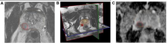 T2-weighted imaging assessment. High-resolution axial, sagittal, and coronal T2-weighted imaging (T2WI) sequences showprostatezonalanatomyandsofttissuecontrast(Fig.4B).T2WIcanbestdetectzonalanatomicalanomaliesinPCacells (or to depict seminal vesicle invasion and extracapsular extension of disease). Normal PZtissueiswater-richwithmany ductalandacinarcomponentsandsparselyinterlacedsmoothmuscle.T2-weighted picturesshowitasbright.PCainthePZ showsasaroundedorill-definedlow-signalintensityfocus(Fig.4A),unlikethelooselypackedtypicalPZtissue.Prostatitis, atrophy,andpreviousbiopsy-relatedhaemorrhagescanmimicalow-signalintensityfocusinthePZofT2-weightedimages. On T2WI, normalTZ tissuelooksdarkerthanthePZdue to its lower watercontent,compact smooth muscle,and sparser glandularcomponents.PCaintheTZappearsasauniform,low-signalmasswithfuzzyborders.Duetoitslargemuscleand fibrouscontent,theTZmaylooklow-signalintensity,makingitdifficulttoidentifycancerfromstromalBPH.[24]DWI.PCa has dense tumor cell areas. The high intracellular/extracellular volume ratio of these locations limits water molecule Brownianmotionintheextracellularspace.DWIdetectswatermolecules'randomBrownianmotion.Changingmagneticfield durationand strength yields two or more DWI pictures (indicated by a b-value). Cancer appears bright hyperintense on DW imaging because restricted water diffusion reduces signal loss. Cancers appear as hypointense dark spots on an Apparent DiffusionCoefficient(ADC) mapmadefromnumerousb-valueDWimages(Fig.4C).ADCreadingspredict cancer aggressiveness.Ultra-highb-valueDWI(e.g.,2000seconds/mm2;Fig.4D)mayimproveindexlesiondetermination.