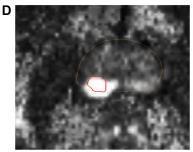 Fig – 4 : The mpMRI depiction of right posterolateral lesion: (A) axial T2-weighted image with lesion inred outline, (B) 3D T2-weighted view of prostate contour (brown) and lesion (red), (C) ADC image with lesion in red outline, (D) computed high b-value = 2000 seconds/mm2 image with lesion in red outline, (E) dynamic contrast-enhanced pharmacokinetic map with lesion in red outline, (F) average time–signal intensity curve plot of the lesion, and (G) PIRADS version 2 location of lesion (orange). Dynamic contrast-enhanced imaging. DCE-MRI uses 3D T1-weighted images before, during, and after intravenous contrast media injection (typically low-molecular-weight Gadolinium chelates that rapidly diffuse in extravascular extracellular space). As said, aggressive tumors produce angiogenic agents that stimulate microvessel proliferation. New microvesselsaredisorderedandleakyduetoweakenedwalls.TumorangiogenesiscausesearlyDCE-MRenhancementinPCa tissue.TheDCE-MRimagesareusuallyanalyzedforlesions(a)qualitatively,byvisual inspection of subtraction time points forpotentiallycancerousspotsshowingfocalenhancement;(b)semiquantitatively,bytime–signalintensitycurveanalysis (Fig. 4F) of suspicious voxels to determine parameters like time-to-peak,wash-inslope, etc.; and/or(c) quantitatively,by compartmentalpharmacokineticmodellingthatusescontrastmediaconcentrationandotherparameters(Fig.4E).