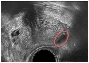 Fig – 3 B-mode US image of the prostate depicting hypoechoic lesion (red oval).