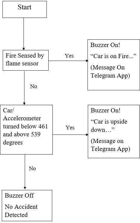 Day by dayaccidentsare increasing in India because of, victim not getting help at proper time. The model designedcanbeasolutiontothisproblem.Whiledesigning thismodelwehaveensuredthatthemodelmusthaveahigh accuracy and must detect the accident immediately, because of the angleof accelerometer set at 461-539 as soon as the tilt happensalert signal gets generated along with location also the flame sensor works fine with great accuracy.Thesystemisfullydependent on internet, so in