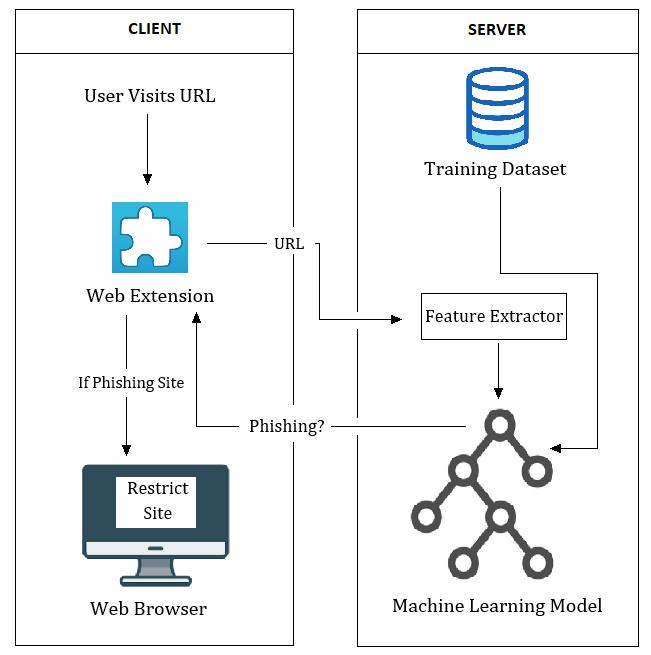 Thesuggestedsystemwillhaveaclient-serverdesign.Onthe client side, a chrome extension will be used to send the Uniform Resource Locator (URL) and Web page source attributetotheserverthattheuserispresentlyvisiting.A cloud-based model for phishing site detection will be constructed on the server side which is trained using randomforestalgorithm.[1]