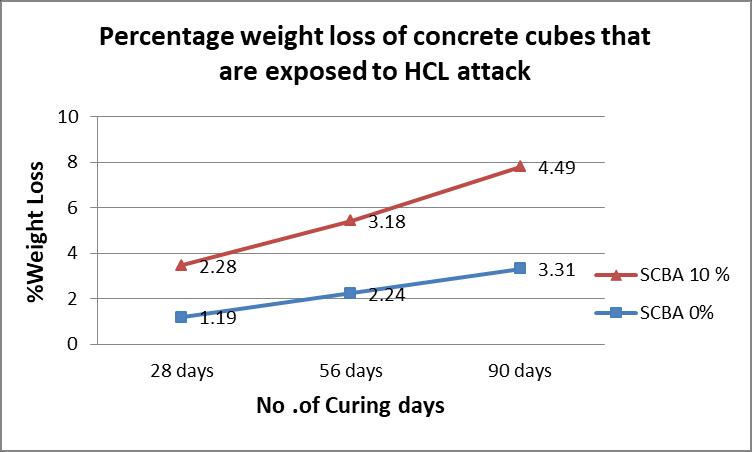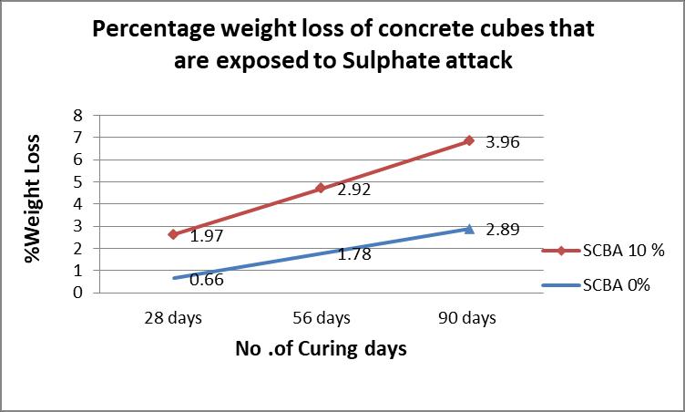 Inthisstudy,thevaluesforweightlossofthecubes attheconclusionofthecuringperiods(28,56and90days) are reported for different replacement amounts of SCBA (0%, 10%). On a graph, these values are plotted. This illustrates the variance in weight loss of cubes containing SCBAatvariouscuringages.Fromourresearch,thelossof weight of cubes is increase in replacement of sugar cane bagasseashcomparetoconventionalconcrete.