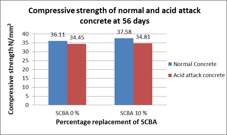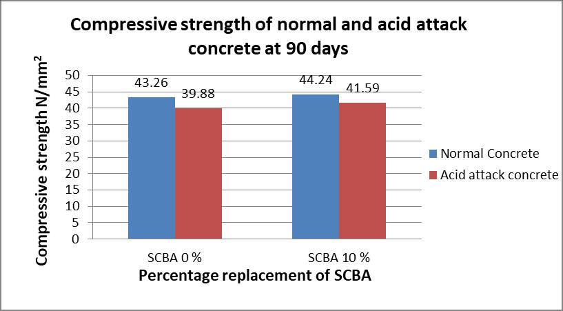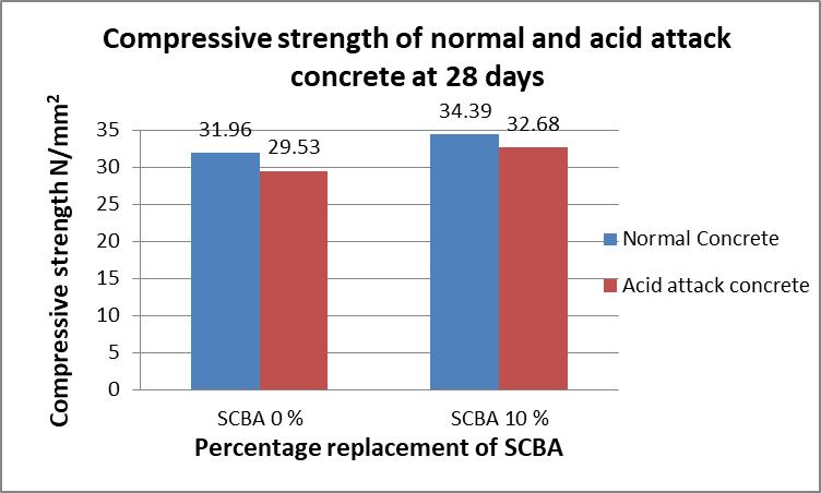 From our research, compressive strength of SCBA 0%isreduceddueto hydrochloricacidattack at28,56,90 daysis7.60%,4.59%,7.81%respectivelycomparedtonormal concreteandCompressivestrengthof SCBA10%isreduced due to hydrochloric acid attack at 28,56,90 days is 4.97%,7.37%,5.99% respectively compared to normal concrete.