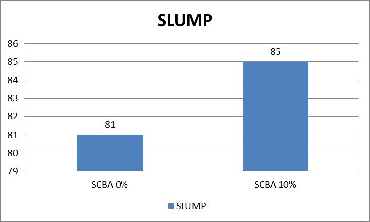 The slump values for SCBA 0% and SCBA 10% successively fluctuate regularly by 81mm and 85mm, accordingtothegraph.Theinclusionofsugarcanebagasse ashwasassumedtohaveimprovedthemix's workability. Whensugarcanebagasseashisusedinplaceofcontrolmix, cementationmixturesrequiremuchmorewater.Thedecline wasseentobeatrueslumpinthenature.Forworkability, noplasticizerwasused.