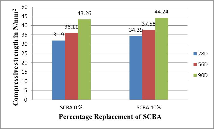 In this study, the value of Compressive strength of concreteforvariouslevel ofSCBA replacement(0%,10%) intowaterandsodiumsulphatesolutionduringthePeriodof 28, 56, 90 days and given in the above table19,20,21. The valuesareplottedingraph.